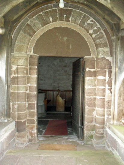 Inside, there is little decoration. The chancel arch is notably plain, but has some lozenge chevron that mimics that on the apse ribs at Kilpeck.