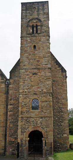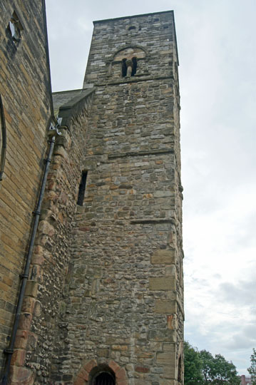 Anglo-Saxon churches of this period did not have towers. The base of the tower would in fact have been the western narthex (entrance porch) to much loftier church to its east. The original roofline if easily visible. The nave would have had aisles to both sides and a rectangular nave. Benedict Biscop employed Gallic masons and his wish was to emulate the Romanesque style of building.