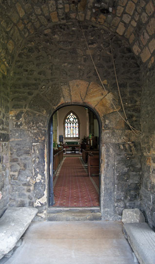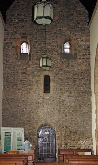 Left: The tower. Just above the second string course the line of the original gabled roof is visible. The masonry either side of this gable and the section above it are probably later Anglo-Saxon from before AD794 and the topmost section is Norman added by Aldwin of Winchcombe. Centre: The original west door to the Anglo-Saxon church, with a stone barrel vault. Right: The west wall of the church. The doorway at first floor level and the two windows above it are all from the original church. What was that doorway for? The only rational explanation seems to be that like many Anglo-Saxon churches - such as Jarrow - this one originally had a western gallery.