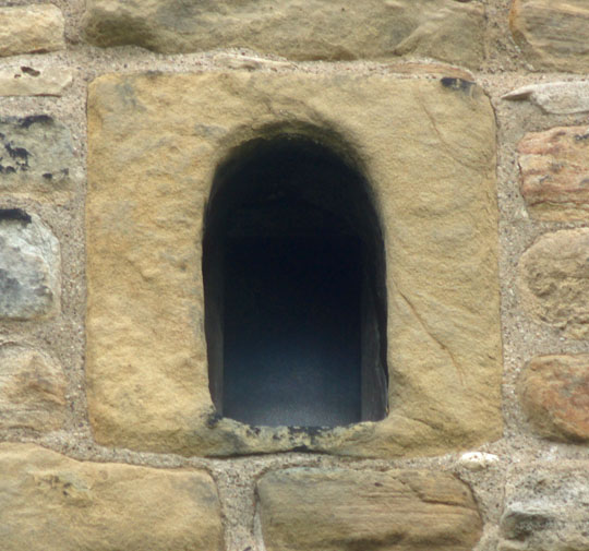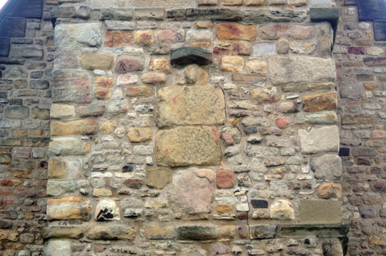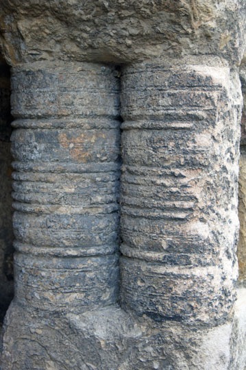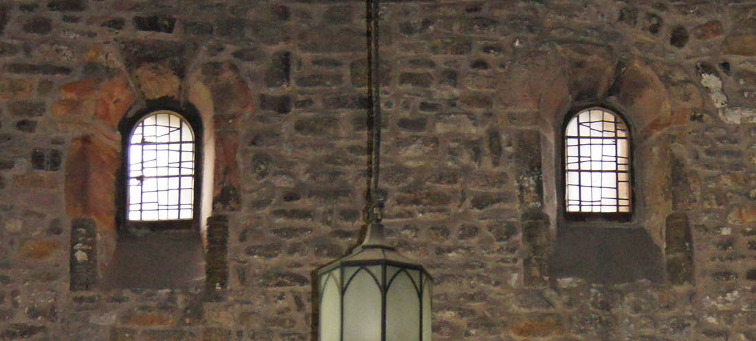 These two windows on the west wall of the church are from the original Anglo-Saxon church. At that time only the lowest parts of the tower would have been present only as a narthex that was considerably lower than the nave of the church. Thus these two windows would have been external windows rather than windows into the tower interior as they are now. Note the way they are shaped from only 5 blocks of stone, including arches of only three voussoirs (arch stones) each. Below the side stones and flanking the splays are turned balusters such as are seen in the west doorway. This is very much a Romanesque device, reflecting Benedict Biscop’s tastes and those of his masons from Gaul.
