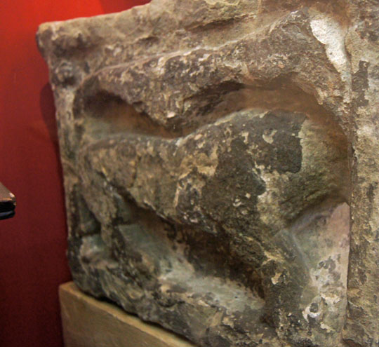 Left: One of the treasures preserved behind glass is the part of the “Abbot’s Seat”. This fragment is from the original church and, as the information board says, may well have been used by Benedict Biscop himself with Bede sitting close by as part of the monastic congregation. Right: The lion symbol represents St Mark.