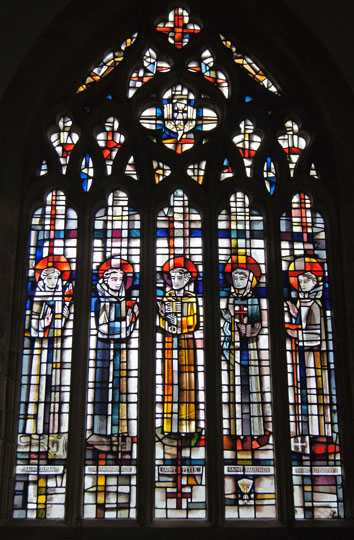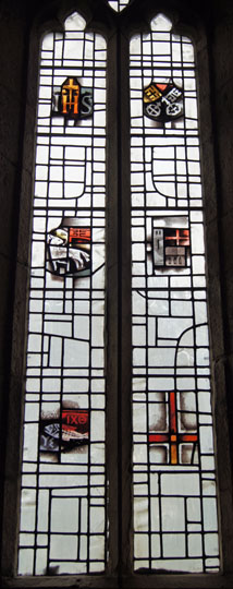 Left: Some fine modern stained glass in the east window replacing damaged Victorian glass by Kempe. The five saints depicted are (from left to right) SS Aidan, Bede, Peter, Paulinus, Cuthbert. I like this glass (so much more delicate than Victorian glass, even that done by Kempe) but not for the first time I do wonder at artistic representations of saints of this kind. As with most saintly iconography only symbolism defines the character (St Peter, for example, is as centuries of tradition demand holding the keys to Heaven). The faces, however, here as elsewhere can only be fanciful. As a piece of art, this window is quite lovely, in my opinion, and you might well ask how else the saints could be venerated but there are times when I do understand why during the Reformation and the Commonwealth such representations were seen as idolatrous! Centre: More modern glass, again of considerable merit. It is interesting how the irregularly-shaped panes themselves add to the art. Imagine the decorated panels sitting within plain glass panes and you will probably see what I mean. Right: The tower seen from the north.