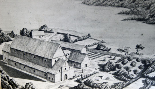 Left: Looking from the nave towards the west wall. It is a somewhat incongruous sight, it must be said, so we must be duly grateful that those responsible for the Victorian rebuilding did not attempt to make their church more uniform by demolishing it! Right: This picture, reproduced from one of the story boards within the church, shows the church and monastery as it would have originally appeared. The church is on the left. At the end nearest to us is the original narthex that would become the base for the tower we have today. Note the two windows either side of it that are still visible inside the church but obscured from the outside by the tower. The chancel is very high in line with normal Anglo-Saxon practice but the aisles are low and narrow.