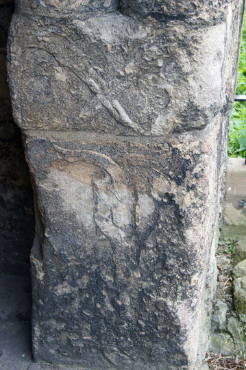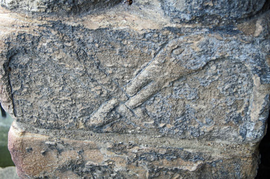 Left: More decorations on the south side of the west door. At the top we have another long-necked bird (a cormorant?) seemingly with a fish speared by its beak. Centre: A remnant of an ancient carving housed in the west porch. Right: More turned balusters of the south side of the doorway.