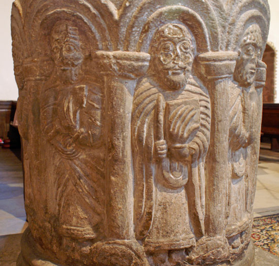 The font has nine apostles around its bowl. All are carrying books and/or candles except one who bears the keys that denote St Peter and is thus the only one identifiable. To emphasise the relative crudeness of this font see the Norman apostle font at Coleshill in Warwickshire.