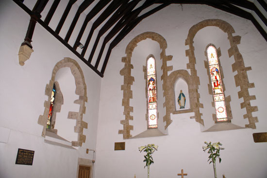 The east end of the chancel with two EE lancet windows either side of a niche.