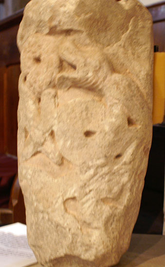 The carved shaft that “proves” that Orleton is part of the Herefordshire School. Sadly, my picture is a poor one (it was a very dark afternoon!) but you can see a dragon (1/3 way from the top) with jaws apart about to bite another. The scaly body and serpent imagery are similar to those found at Kilpeck.