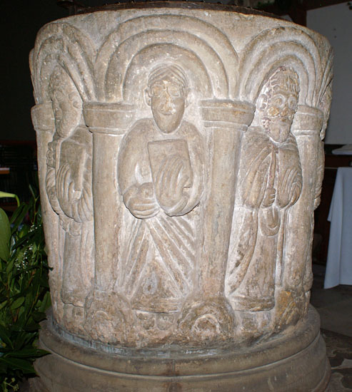 The font has nine apostles around its bowl. All are carrying books and/or candles except one who bears the keys that denote St Peter and is thus the only one identifiable. To emphasise the relative crudeness of this font see the Norman apostle font at Coleshill in Warwickshire.