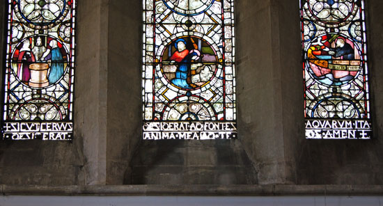 The stained glass in the at the west end of the church celebrates the font in the circular light in the left-hand lancet and with the font inscription reproduced across the three,
