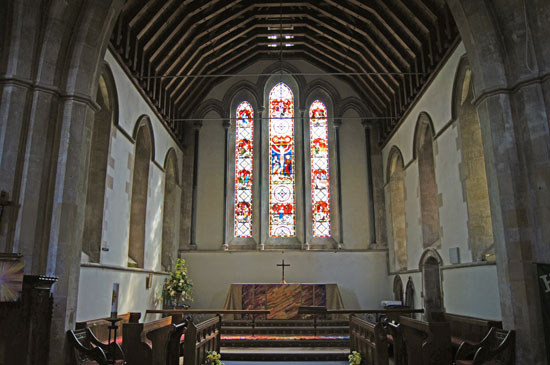 Looking into the chancel. We can see the typical Early English three-light configuration of lancet windows. in this case flanked by two “blind” recesses. To north and south you can see more lancet windows.