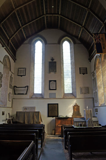 Looking back towards the west end one sees yet another three light lancet window configuration with more to north and south. Note that even the north and south doors are directly opposite to each other. The font in the background, by the way, is the c15 one that the church uses, not the now-redundant Saxon one.