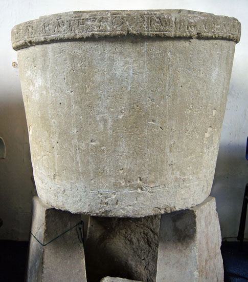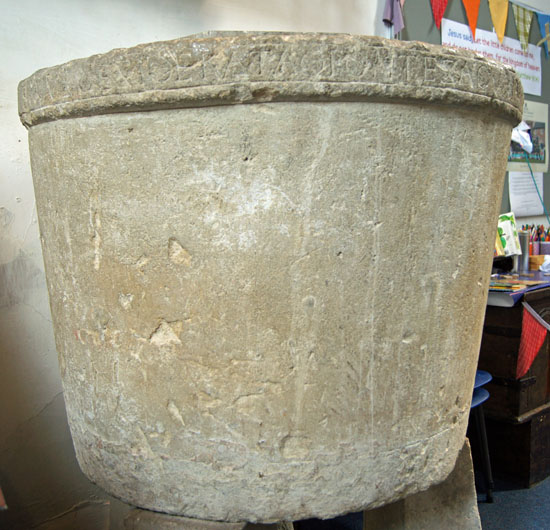 Potterne, however, does have one extraordinary treasure: its Anglo-Saxon font that dates from the ninth century. Now I have to admit that it does look much, and I imagine the casual visitor might not spare it a second glance, but it is one of the oldest in England. It is a plain bowl but around its rim is an inscription in Latin taken from Psalm 42: “Sicut cervus desiderat ad fontes aquarum ita desiderat anima mea ad te deus amen”: “As a deer longs for the running brooks, so longs my soul for you, O God”. Lovely poetry. In typical English fashion it was found under the nave floor in 1872!