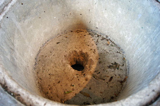 Looking into the font bowl with its drainage hole.