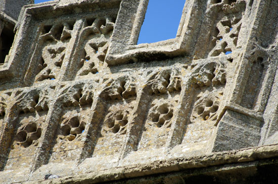 Detail of the decorative carving on the battlemented parapet of the tower. Note that it is identical in style with that on the top stage of the tower itself (left).