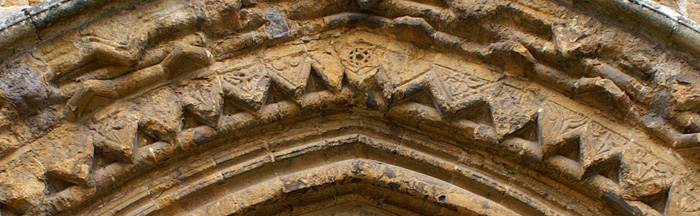 From this picture you can see that there are faint but nevertheless discernible decorations on the zig zags above the door. It is rather a strange mix with one or two of the designs looking as if they might resemble Romanesque beakheads. More intriguing is the pentagram design at the centre of the arch. This is not a six-sided “double trinity” star but clearly a pentagram. Few icons are more ambiguous, having significance in wicca, tarot and all manner of new-age flummery. We have some choices as to what this example might mean: possibly to signify the 5 wounds of Christ; as a symbol of the Star of Bethlehem; or, perhaps more prosaically, as an amulet - a good luck symbol.