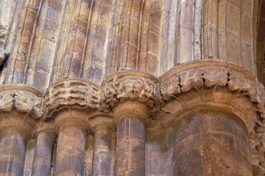 Left: The west door betrays the “transitional” nature of much of the twelfth century work. The arch is pointed and is supported by several orders of shafts - a long way removed from the chunky functionality of Romanesque doorways, Yet we seen distinctly Norman-looking zig zag decoration. Look closely though (below) and there are some peculiar and non-Romanesque decorations on these zig zags. Right: West door capitals. The head is surrounded by beautifully-varied clumps of foliage that seem to point to this being a “Green Man”. There are no leaves emanating from his mouth, however.