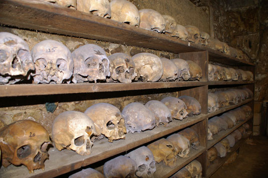 Left: The ossuary. This is one of only two in Britain. The other is in Hythe in Kent. These people have been dignified by having their heads individually placed on racks…whereas (right) , this is one of the great piles of bones that occupy the centre of the crypt.