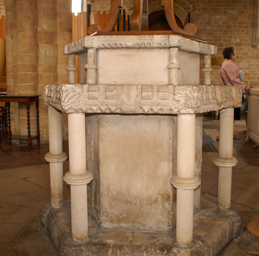 Left: The very peculiar font. The tub is a plain hexagonal affair but the two orders of decoration are very clearly Norman. Add in the modern supporting pillars and you get what one book calls “a wonderfully gimcrack construction”! Right: Stiff leaf capitals on the arcades.