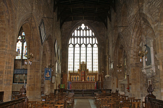 Left: Looking towards the chancel. Note the mellow and unadorned stonework and the pleasing symmetry of the arcades and chancel arch. Right: The Sanctuary and Chancel.