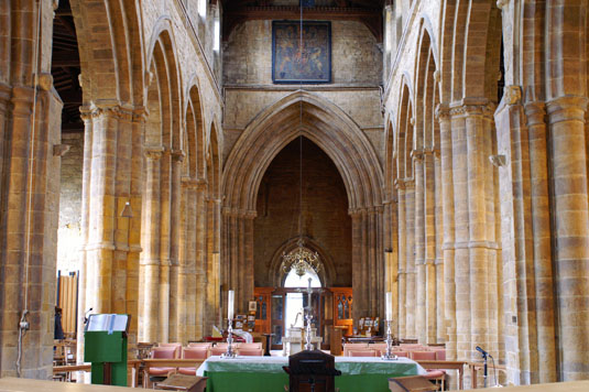 Left: The sanctuary has two orders of windows. The lower stage is Norman and the upper stage is fourteenth century. Right: Looking west to the fourteenth century tower arch.