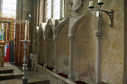 Left: A cheeky face peering out from one of the capitals accompanied by a lady with a whimple. Right: The piscina (furthest away) and the four-seater sedilia. The piscina is almost unique in having three drainage holes. The four seat configuration is very unusual too.