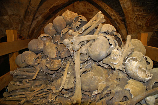 Left: The ossuary. This is one of only two in Britain. The other is in Hythe in Kent. These people have been dignified by having their heads individually placed on racks…whereas (right) , this is one of the great piles of bones that occupy the centre of the crypt.