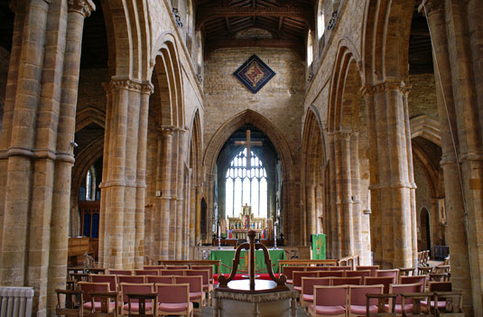Left: Looking towards the chancel. Note the mellow and unadorned stonework and the pleasing symmetry of the arcades and chancel arch. Right: The Sanctuary and Chancel.