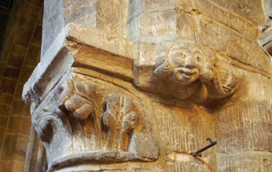 Left: The west door betrays the “transitional” nature of much of the twelfth century work. The arch is pointed and is supported by several orders of shafts - a long way removed from the chunky functionality of Romanesque doorways, Yet we seen distinctly Norman-looking zig zag decoration. Look closely though (below) and there are some peculiar and non-Romanesque decorations on these zig zags. Right: West door capitals. The head is surrounded by beautifully-varied clumps of foliage that seem to point to this being a “Green Man”. There are no leaves emanating from his mouth, however.