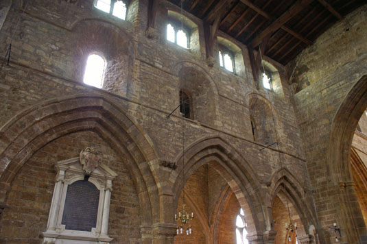 Left: The sanctuary has two orders of windows. The lower stage is Norman and the upper stage is fourteenth century. Right: Looking west to the fourteenth century tower arch.