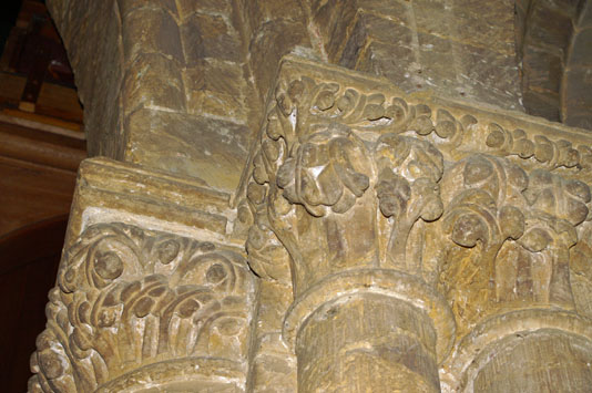 Left: The very peculiar font. The tub is a plain hexagonal affair but the two orders of decoration are very clearly Norman. Add in the modern supporting pillars and you get what one book calls “a wonderfully gimcrack construction”! Right: Stiff leaf capitals on the arcades.