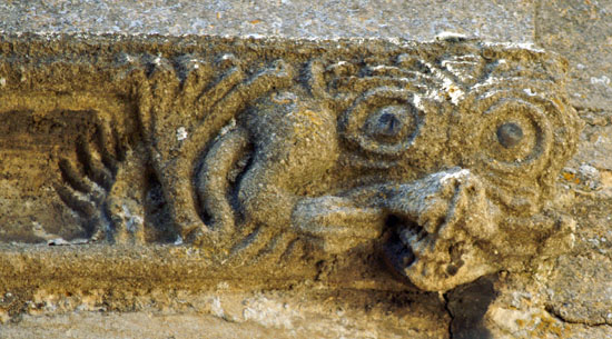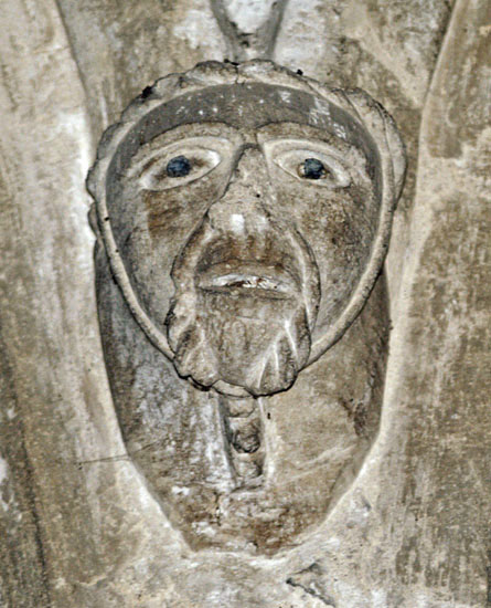 The greatest treasures, in my view, are the two human images at the bottom of the left hand column. They are found on diametrically opposite positions on the south porch. The upper figure holds a masons hammer in his left hand and you can also see a miniature millstone. What he holds in his right hand is not obvious but my surmise is that it is a bread shovel - the long implement used by bakers to place loaves in the back of the oven. This we have three trades represented: mason, miller and baker. The other figure clutches a flaming hammer in his right hand - the tool of the blacksmith. His left hand clutches what appears to be a sheaf of cloth and probably represents the fuller. Thus we haev five village trades represented in two carvings. The faces are very human and it is difficult to believe they are not real people, especially the very distinctive upper figure with moustaches and very strange hair!
