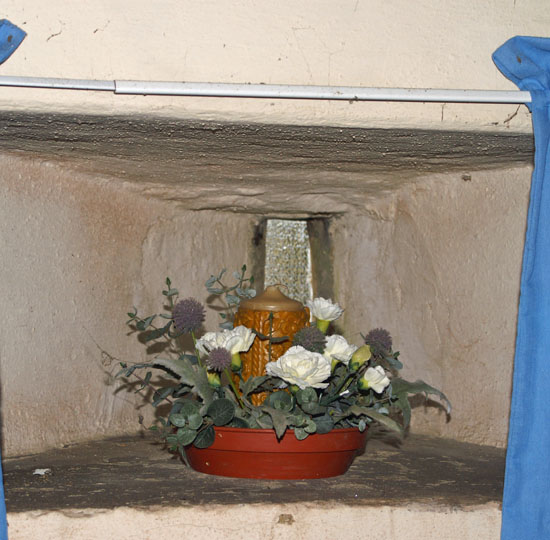 Left: The fine double sedilia with ogee arched canopy and crocket decorations. The right hand arch is rather lopsided! Centre: This memorial on the north side of the chancel is to the memory of the unfortunate Samuel Barker who, the son of the Vicar of the day, who died in 1696 at the tender age of 2 years and 15 days. The memorial leaves us in no doubt that a prodigy had been lost to the world : “… a child of admirable sweetness of temper of an erect and comly (sic) body, of a most pregnant wit, even what could be imagined….” Right: On the west wall of the north aisle, suitably honoured with curtains and flowers, is the squint from what was once the anchorite cell.