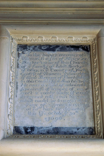 Left: The fine double sedilia with ogee arched canopy and crocket decorations. The right hand arch is rather lopsided! Centre: This memorial on the north side of the chancel is to the memory of the unfortunate Samuel Barker who, the son of the Vicar of the day, who died in 1696 at the tender age of 2 years and 15 days. The memorial leaves us in no doubt that a prodigy had been lost to the world : “… a child of admirable sweetness of temper of an erect and comly (sic) body, of a most pregnant wit, even what could be imagined….” Right: On the west wall of the north aisle, suitably honoured with curtains and flowers, is the squint from what was once the anchorite cell.