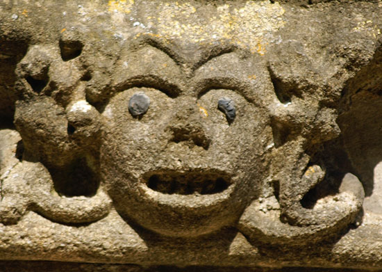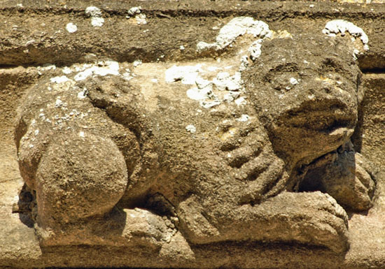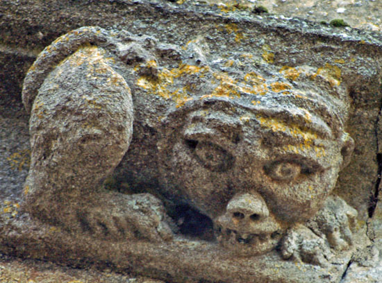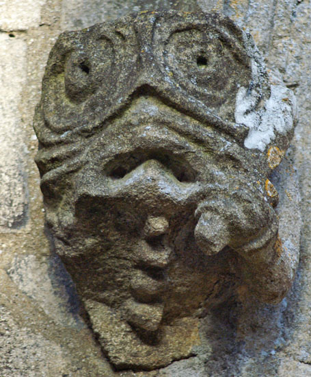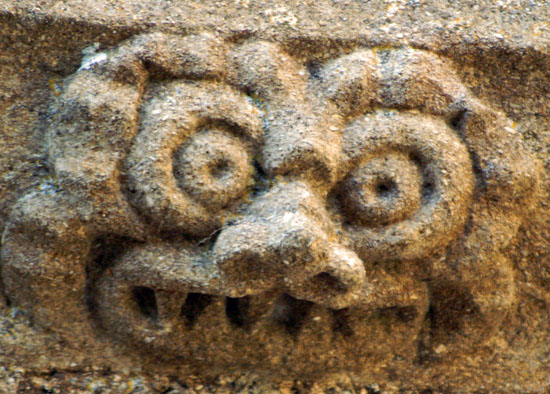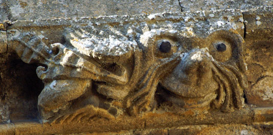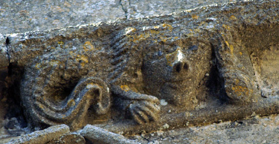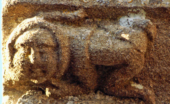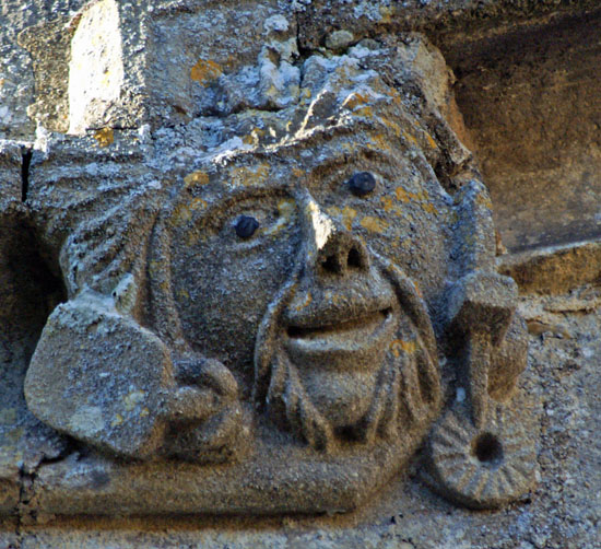 The greatest treasures, in my view, are the two human images at the bottom of the left hand column. They are found on diametrically opposite positions on the south porch. The upper figure holds a masons hammer in his left hand and you can also see a miniature millstone. What he holds in his right hand is not obvious but my surmise is that it is a bread shovel - the long implement used by bakers to place loaves in the back of the oven. This we have three trades represented: mason, miller and baker. The other figure clutches a flaming hammer in his right hand - the tool of the blacksmith. His left hand clutches what appears to be a sheaf of cloth and probably represents the fuller. Thus we haev five village trades represented in two carvings. The faces are very human and it is difficult to believe they are not real people, especially the very distinctive upper figure with moustaches and very strange hair!