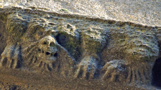 Careful study of the bestiary on Ryhall Church reveals quite distinct groupings. The group above come from the south wall of the chancel. We do see here some fairly recognisable motifs. The bull (top left) is pretty obvious, with possible a crude lion to his right. Top right is a strange figure with a definite owls face but an animal’s body. The owl seems to have something in its mouth. Lower left the human-like figure seems to be - there is no way to put this delicately - scratching his bum! Centre left is what looks very much like a jester, Lower right is hard to make out. Does the figure have spider-like limbs? Is some creature on his head?