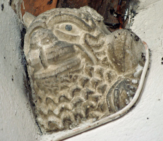 Left: Except for during his earliest days, Kempe always incorporated a trademark wheatsheaf into his windows. This is Ryhall’s. Right: And finally, another grotesque, this time from the interior.