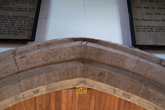 Inside, there are two three-bay arcades. Both date from the thirteenth century and are in Early English style. The north arcade is slightly the earlier. Water leaf capitals are predominant and most of the capitals and piers are circular. There is a fine double-seat sedilia in the chancel with crocketed canopies. In keeping with the exterior, there is a head of some kind at every available intersection in the nave, although they are human rather than grotesque, here we might indeed suspect that some of the heads were of the aforesaid “local worthies”. Sadly, the most imposing figure of St Christopher, occupying his traditional place opposite the south door, has been badly damaged but is still of interest.