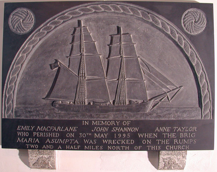 “I was the sculptor who designed and carved and fixed into position the slate memorial to the Brig MARIA ASUMPTA which is in the church. This was done eleven years after the wreck which happened in 1995. I was one of the 11 survivors and first to leave the ship that fateful day. I still carry some injuries, thankfully minor, from the shipwreck. I was told that the memorial is unique to Cornwall, being carved by a ‘survivor’ of a shipwreck.”