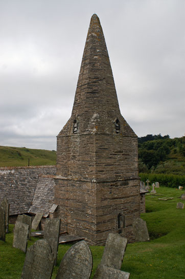 Left: The south door of the church. Note the south aisle was added only to the east of the doorway. Right: The church from the north east with the sea in the background. Because the tower is to the side of the church and because the south aisle runs only part of the way along the church is is not obvious at first glance which is the west and which is the east end of this church.