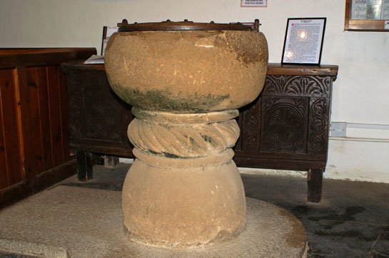 The bulk of the church was built in 1430. it comprises a nave, a chancel, a short south aisle and a tower, the base of which forms a tiny transept.However, some parts of the church clearly pre-date 1430, although strangely many accounts of the church overlook this. The crude round-topped tower arch and the tower’s deeply-splayed window are clearly Norman. There is also a Norman font. Simon Jenkins refers to the church’s “Victorianised Norman interior”. I think it is possible that the nave was indeed originally Norman, but I am far from convinced about the aisle and its arcade. This is a remote church and has no great claim to fame other than its Betjeman associations. We should not, perhaps, be too surprised if its architectural evolution is not well-documented. In any event, this is a church to enjoy rather than to study!