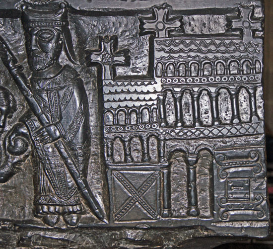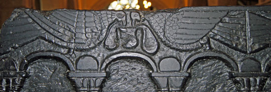 The west face has arcading as its main motif. Here, however, it is surmounted by four symmetrical pairs of doves drinking from cups.