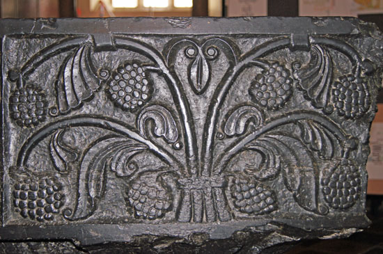 The font here at St Mary Bourne is less spectacular than that at nearby Winchester Cathedral (pictures below) or at Thornton Curtis. Two sides are decorated with intertwined vines and grapes; two with “blind arcading” decoration. The surround of the font’s bowl is much wider than on a conventional stone font and this area, especially the corners are also heavily decorated.