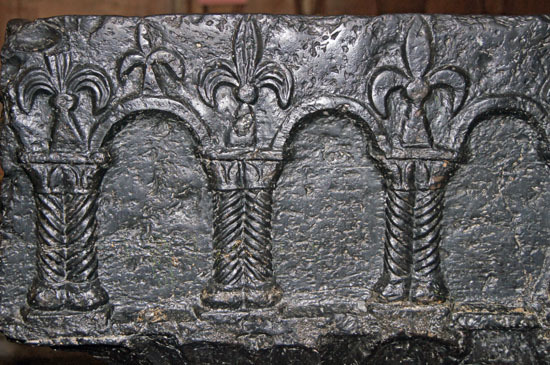 A section of the north face showing the arcade motif, the pillars in pairs and with “barley sugar” twists. Above this design are fleurs de lys which represent the purity of the Virgin mary and which also, of course, adorned the French flag in mediaval times.