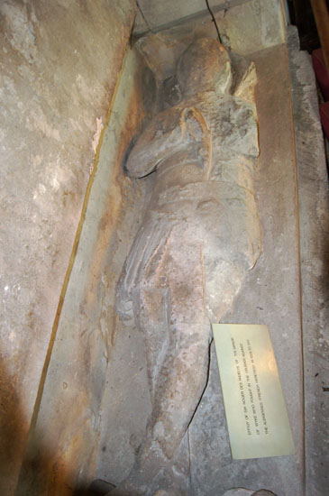The rest of the church is pleasant but unremarkable, with the usual unruly patchwork of Gothic windows, some of them quite modern. Apart from the font, one of the most interesting features is a Crusader tomb in the Lady Chapel which dates from about 1330. Don’t, however, conjure up a mental picture of some brave soldier making the arduous journey to the Holy Land to face “Saracens” and Mamelukes. This soldier is believed to be Sir Roger des Andelys of Wyke Manor who was killed in the Crusade against the “heretic” Cathar (or “Albigensian”) sect in Southern France! If you know of this Crusade you might feel, as I do, that the participants were somewhat less than heroic - although one has to beware of making judgements 900 years after the event. More about this in the footnote below.