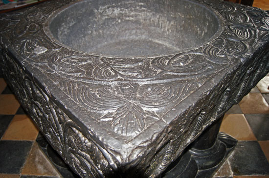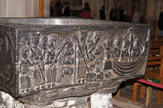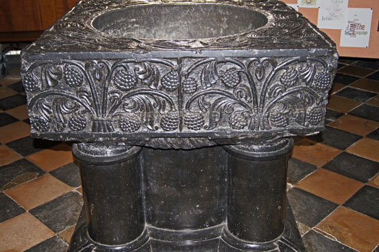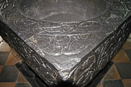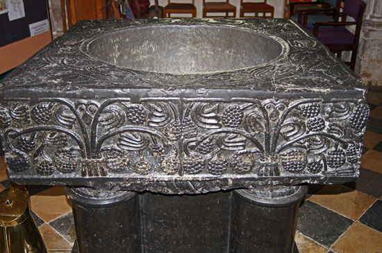 So to the font. Tournai Marble comes from quarries around the town of that name which is now in the Walloon area of Belgium. As with many European “marbles” (including, for example, our own Portland Marble) Tournai is in fact a form of limestone. In the c11 Tournai was part of France. The “marble” is bluish-black and would have been transported along the River Scheldt to the sea at Antwerp. The fonts would have been carved in the region and transported as finished products. There are only seven in England. The fact that four of the seven are in Hampshire leads to the conclusion that they were the gift of the wealthy and generous Henry de Blois, Bishop of Winchester (the cathedral itself has a Tournai font) from 1129 to 1171 and grandson of William the Conqueror. There are about 17 in France, 10 in Belgium and just two in Germany. Such bulky artifacts must have presented a considerable transport problem on the overland sections, so perhaps it is unsurprising that there are so few outside France and Belgium. and that those in England are all close to rivers.