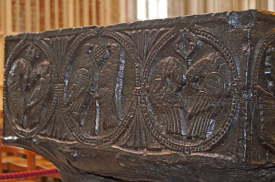Above: Close up of the doves and cups. Note the large drops overflowing from the cups. The very informative and authoritative Church Guide suggests that the doves may be the souls of the faithful and that the overflowing water is “symbolic of the living water, overflowing, abundant life (John 4.14)