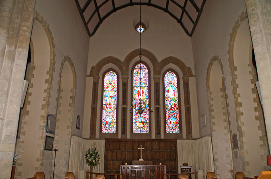 The chancel dates only from around 1600. Round headed arches to both side chapels and an east window in Early English triple lancet style, however, fit harmoniously with the nave. Note that the chancel is conspicuously shallow in depth.
