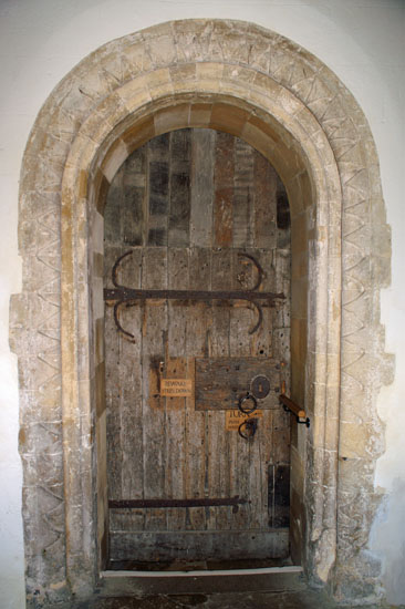 The door is not Norman. Note, however, two iron rings. The one above is the door pull and the one below is a “sanctuary ring”.
