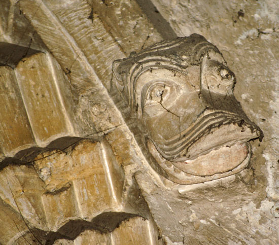 The chancel arch is adorned by this splendid capital with two lions back to back is a superb example of Celtic influence in Norman art. On the right is a wonderful “label stop” at the end of an arch in the form of a monster’s head - an unusually benign-looking monster at that!