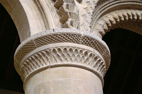 at the intersections of the arches (right). There are few better Norman arcades in the country.